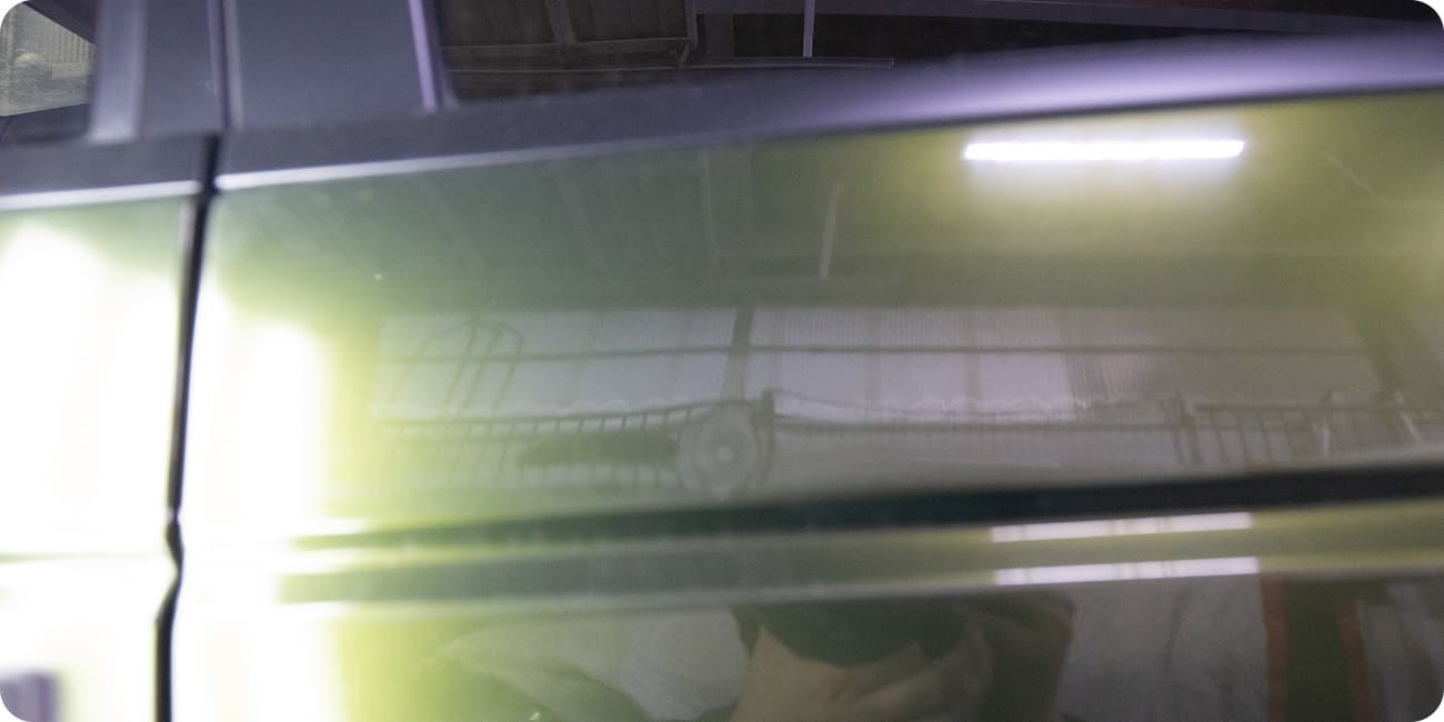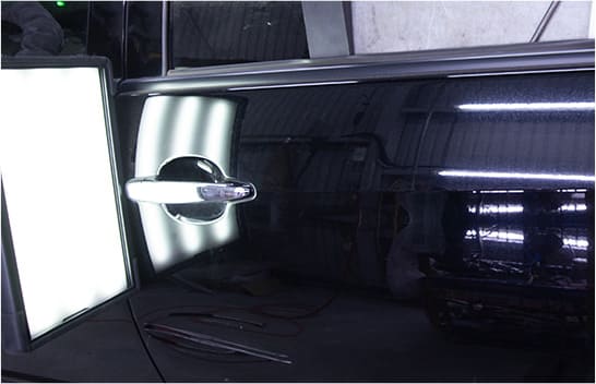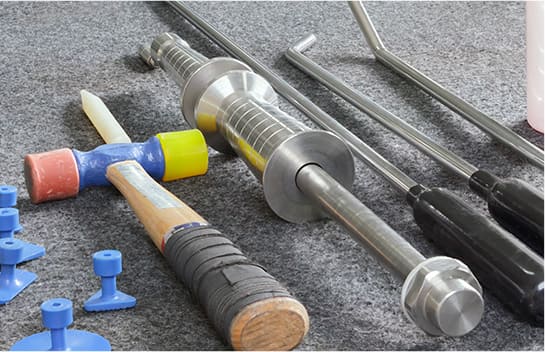 デントリペアはテコの原理でヘコミを押して直します。車体内部の骨格、インナー、ステーなどキズやヘコミなどのダメージを与えていけない部分があります。熟知したうえであとに残らない修理で見た目も中身もキレイに仕上げます。